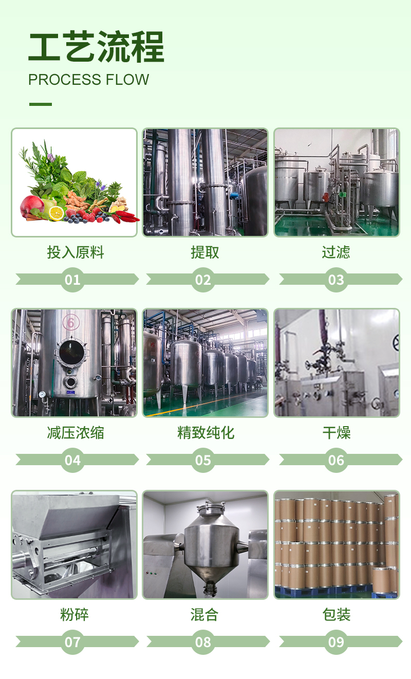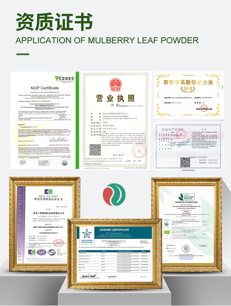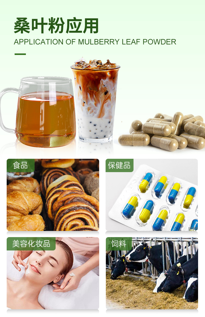 桑葉提取物以春蠶后期或霜降前桑樹枝條上的第1~3位新葉加工的桑葉粉為原料,陰干,粉碎,分別用正丁醇、90%乙醇和水加溫浸提,并噴霧干燥而得,提取物中含有桑葉黃酮、桑葉多酚、桑葉多糖、DNJ、GABA等多種生理活性物質。